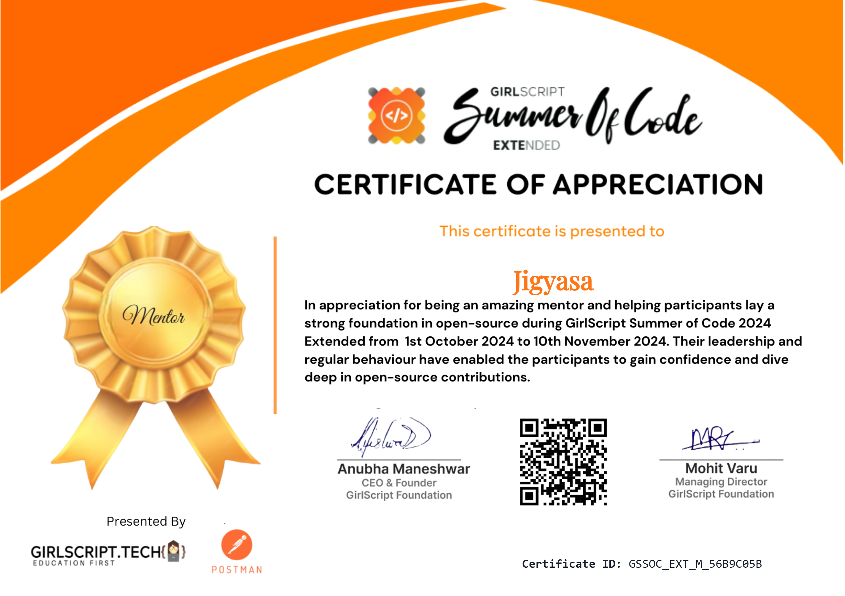 As a mentor in the GirlScript Summer of Code (GSSOC) 2024, I guided aspiring developers in the data domain, helping them enhance their skills and contribute to impactful open-source projects. It was a rewarding experience fostering growth and collaboration in the tech community.
