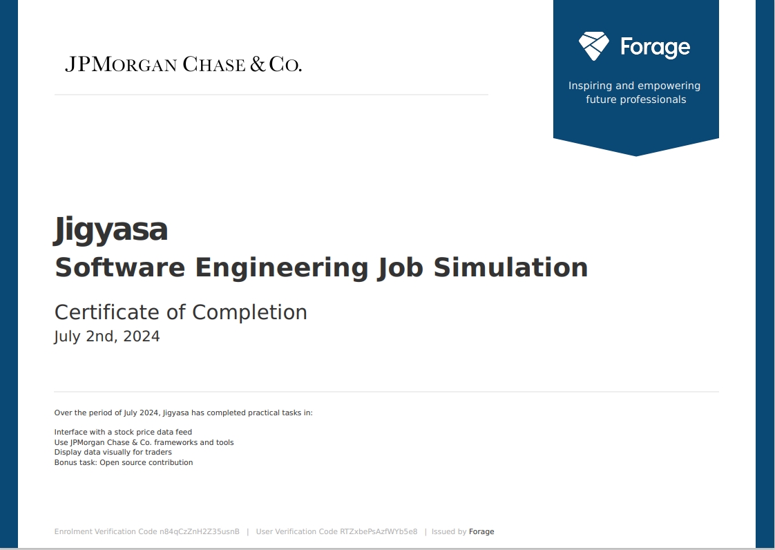 I completed J.P. Morgan's Software Engineering simulation on Forage, where I established a local development environment by downloading the necessary files, tools, and dependencies. I also fixed broken files in the repository to ensure the web application functioned correctly. Additionally, I utilized J.P. Morgan Chase’s open-source library, Perspective, to create a live graph that effectively displays a data feed for traders, enhancing visual clarity and usability.
