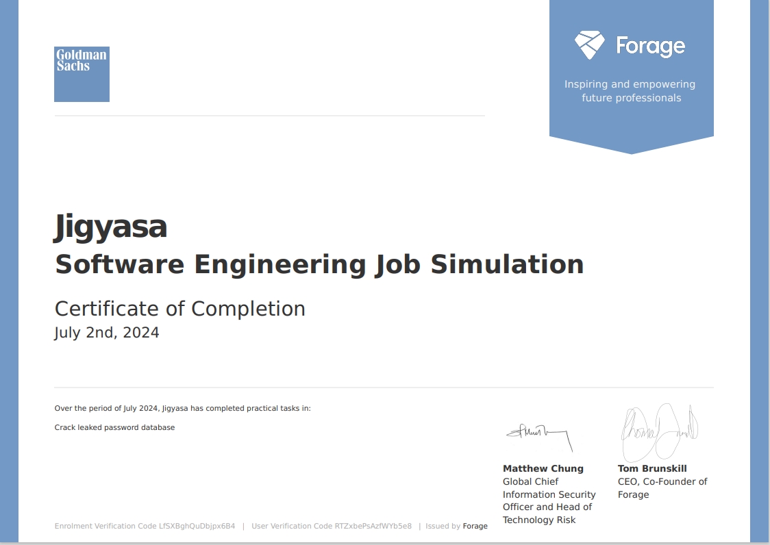 I completed Goldman Sachs's Software Engineering simulation on Forage as a governance analyst, where I assessed IT security and identified an outdated password hashing algorithm through password cracking with Hashcat. I wrote a memo proposing enhancements to strengthen password protection, including extending minimum password length and adopting a dedicated hashing algorithm.