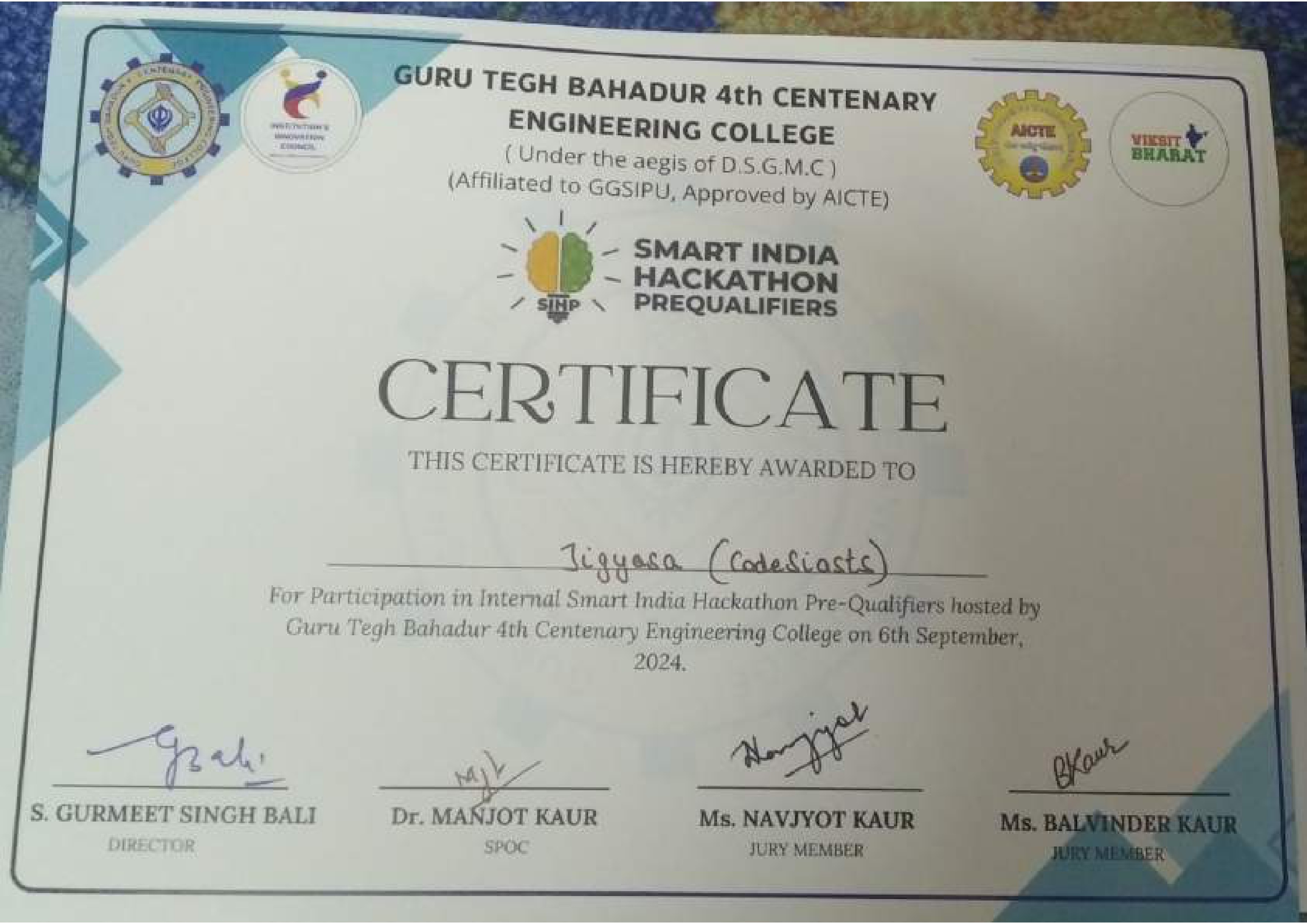 I participated in the SIH 2024 Pre-Qualifier, which allowed me to showcase my skills in problem-solving and innovation. During this event, I collaborated with a team to develop solutions for real-world challenges, enhancing my technical abilities and team collaboration experience. This opportunity sharpened my understanding of the importance of teamwork.