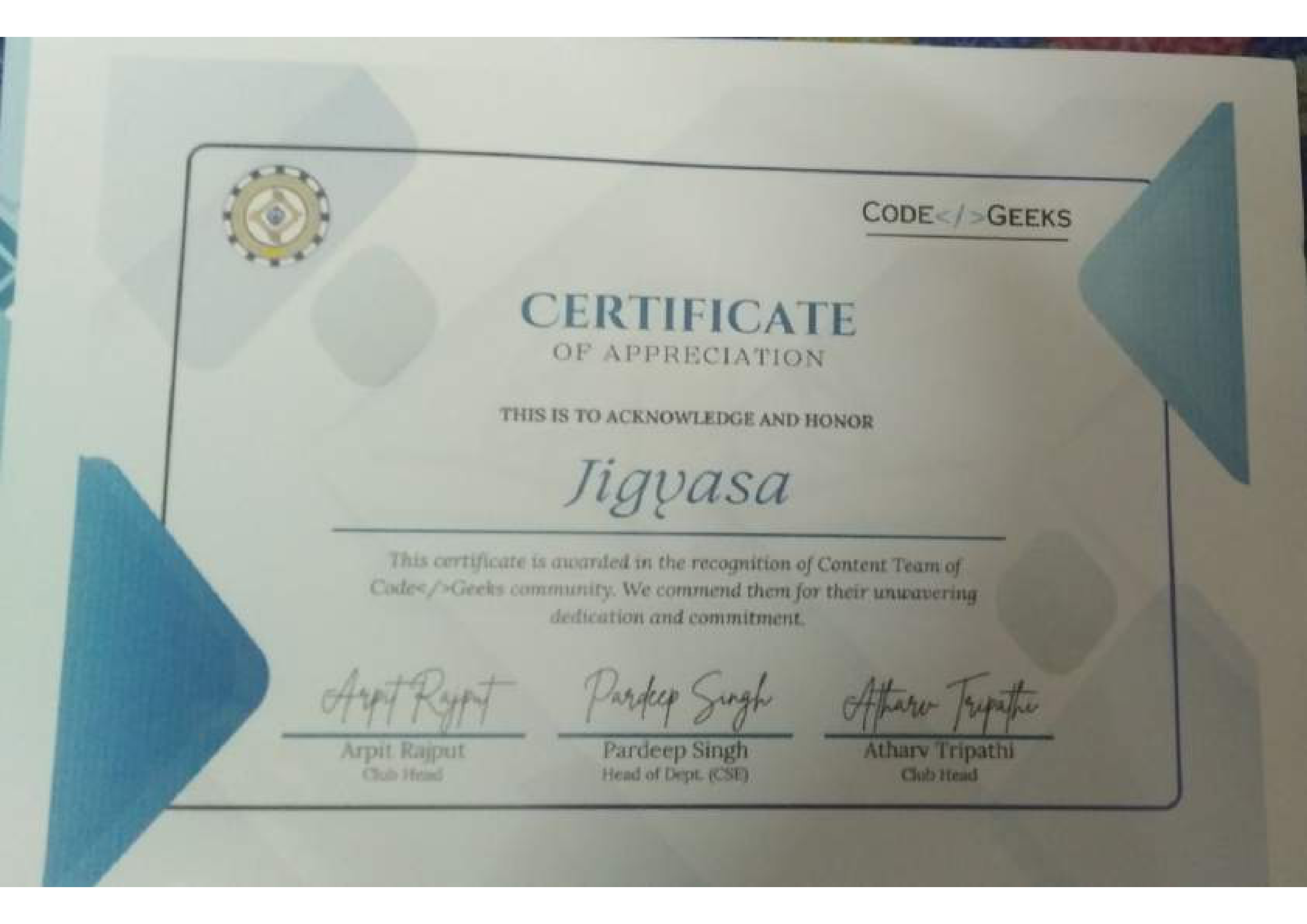 As a member of the content team for my college's coding club, Code>Geeks, for one year, I honed my skills in technical writing, content creation, and digital communication. I collaborated with team members to develop engaging tutorials, articles, and resources that helped foster a supportive learning environment for our community.