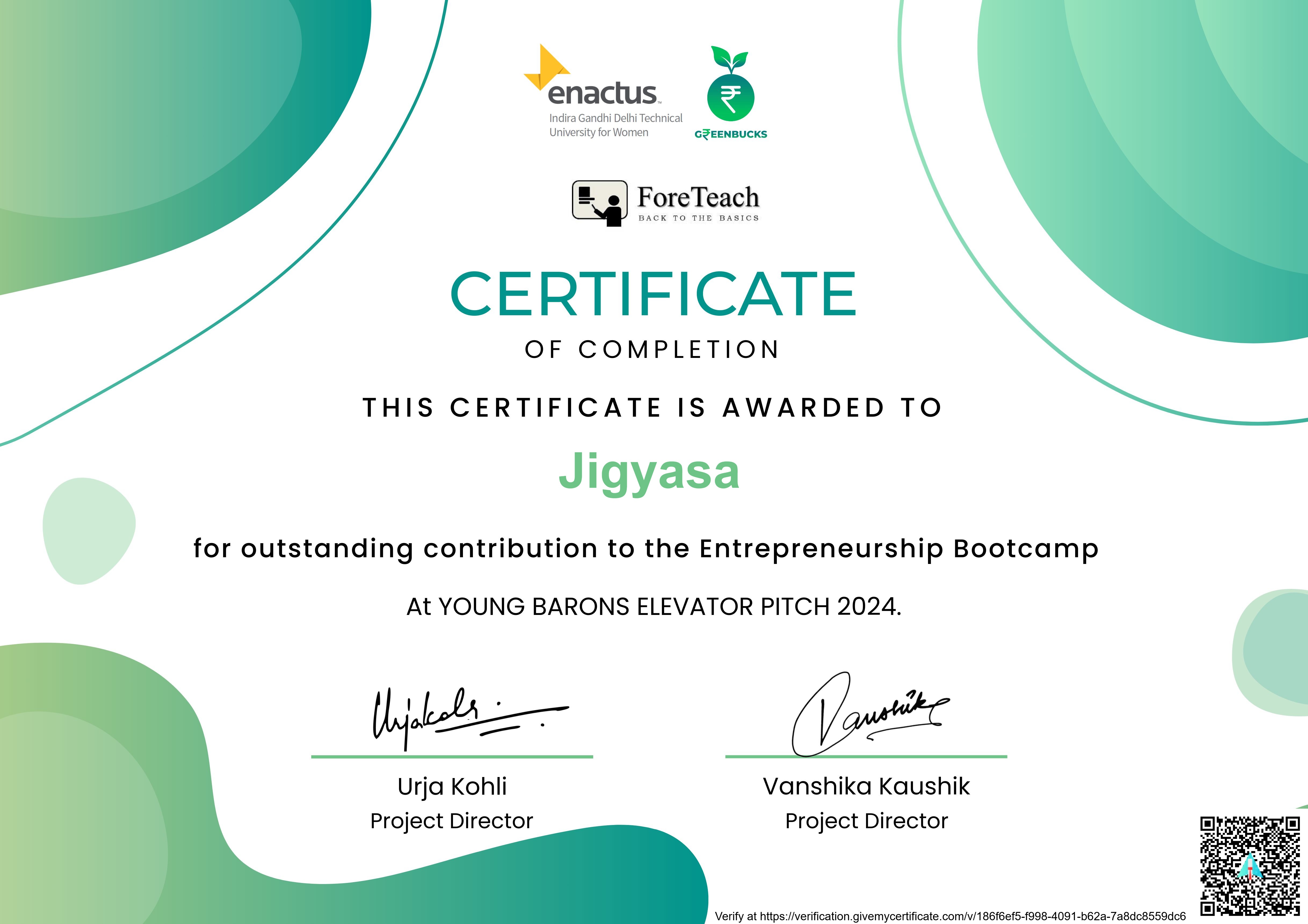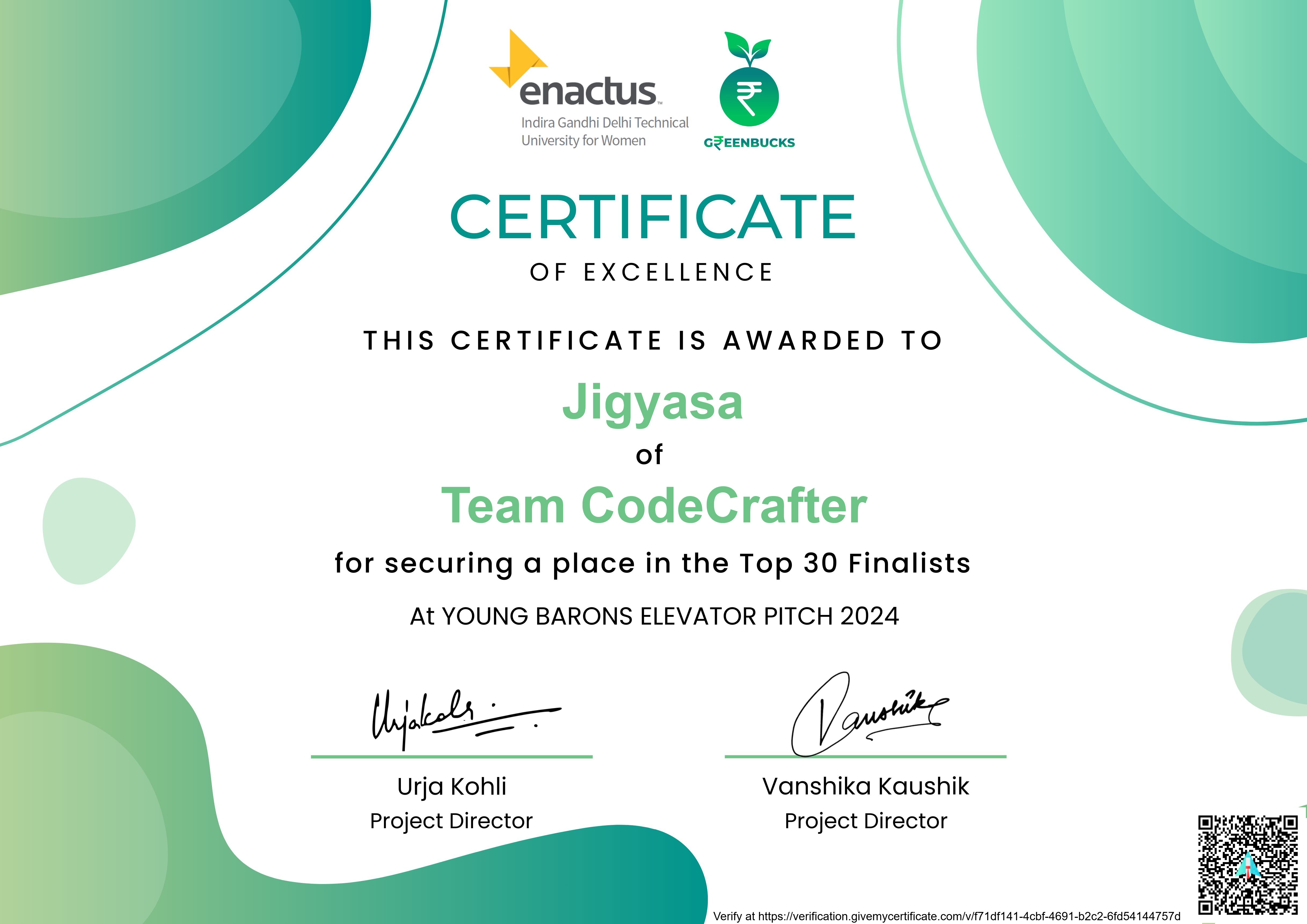 Participated in the Young Barons Elevator Pitch - YBEP 2024, organized by Project Greenbucks, Enactus IGDTUW, where I was among the top 10 finalists! I had the incredible opportunity to pitch my business idea to esteemed judges from all over India. It was a great experience that allowed me to showcase my passion.