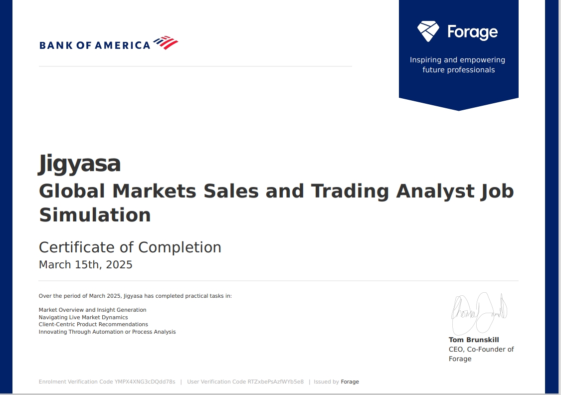 I completed a job simulation in the sales and trading division, where I analyzed market trends using Excel and Bloomberg to provide client-centric solutions. My work involved conducting in-depth data analysis, recommending strategies to optimize trade execution and workflow efficiency, and developing a tailored client proposal focused on investment strategies like portfolio diversification and sustainable growth.